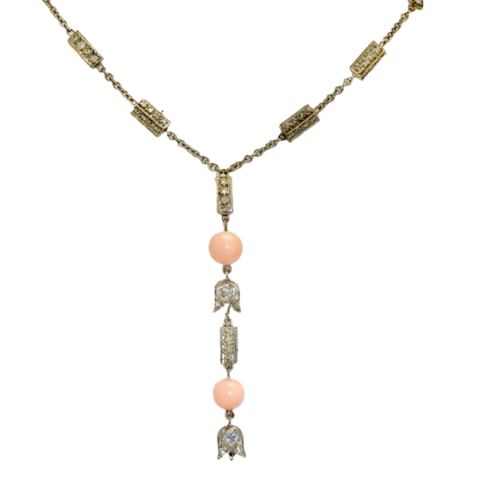 Lilly of the Valley on Rolo Chain with Diamonds & Angel Skin Coral Necklace Designed & Handmade by Kaufmann de Suisse in 18kt White Gold featuring 130 Rround Brilliant Cut G/SI Quality Diamonds weighing a total of 1.32cts and 2 x 7mm Angel Skin Coral Beads, 2.25 inch drop