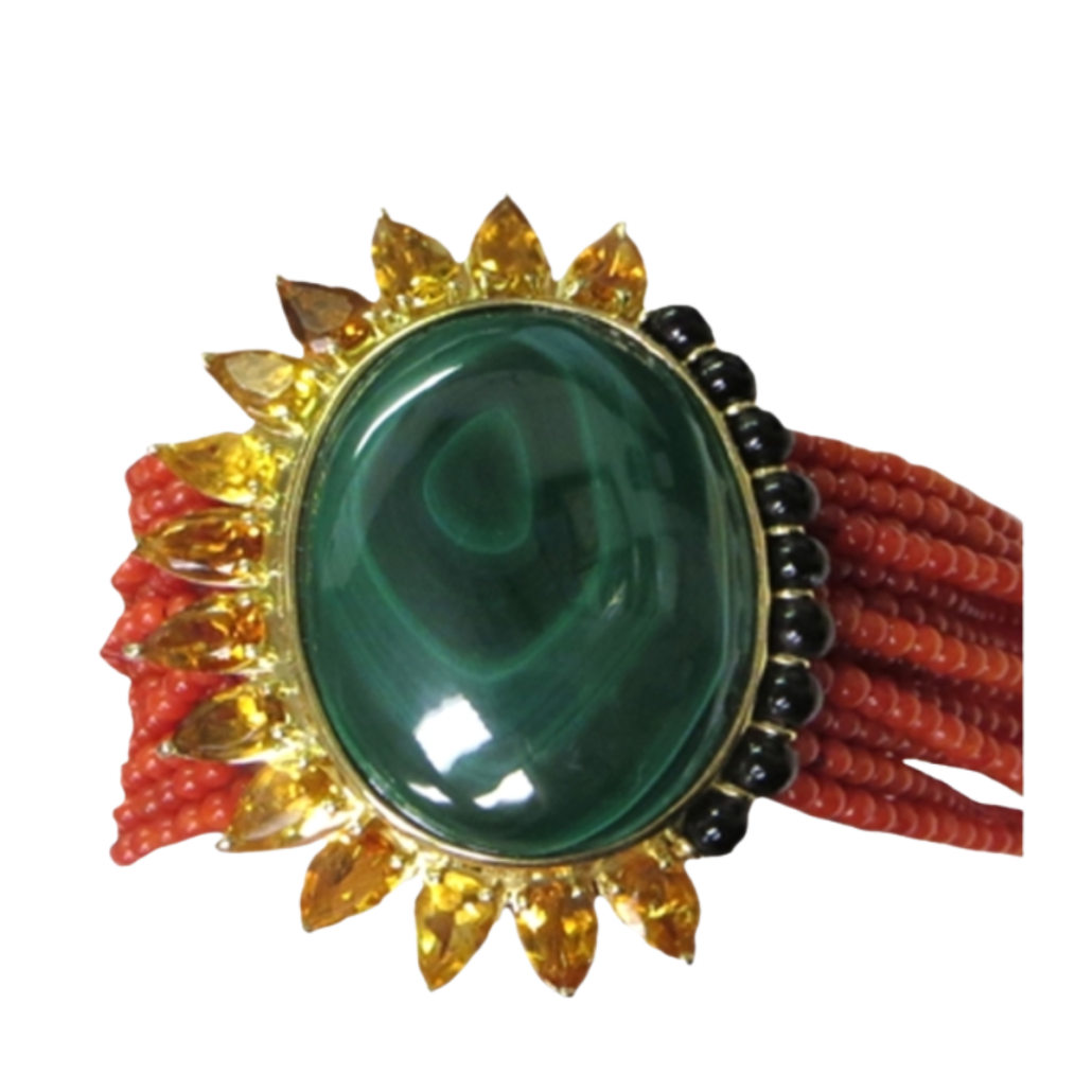Malachite, Citrine and Onyx Beads on multi-Strand Coral Bead Bracelet Designed and Handmade by Kaufmann de Suisse in 18kt Yellow Gold fetauring 1 Oval Malachite measuring 36 x 26mm, 9 Round 4.5mm Onyx Beads, 14 Pear Shape Citrines weighing a total of 8cts and 12 Stands of 3mm Red Coral Beads