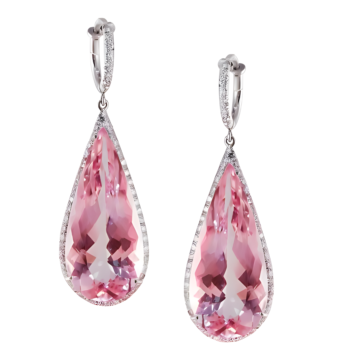 Morganite Teardrops and Diamond Halo Earrings Designed & Handmade by Kaufmann de Suisse in Platinum featuring 2 Pear Shaped Morganites weighing a total of 37.19cts and 101 Round Brilliant Cut G/VS Quality Diamonds weighing a total of 1.01cts
