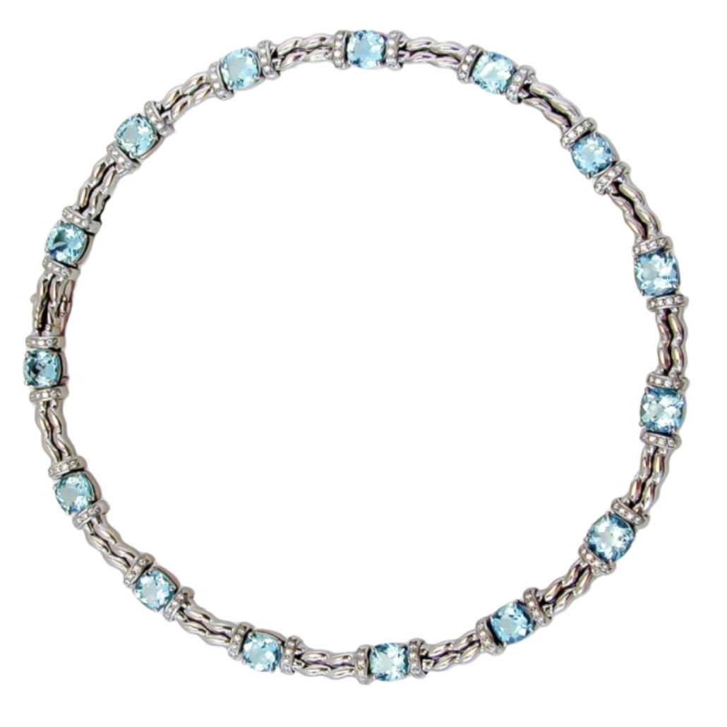 One of a Kind Flowing Lines Aquamarine & Diamond Necklace Designed & Handmade by Kaufmann de Suisse in 18kt White Gold featuring 15 Cushion Cut AAA Quality Aquamarines weighing a total of 29.92cts and 120 Round Brilliant Cut Diamonds weighing a total of 1.18cts