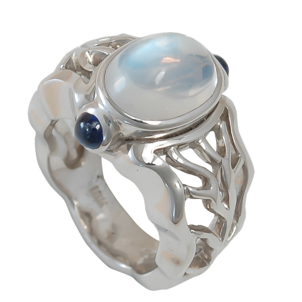 Open Flowing Lines Moonstone and Sapphire Ring Designed & Handmade by Kaufmann de Suisse in 18kt White Gold featuring one Cabochon Cut Moonstone weighing 3.36cts, flanked by two Round Cabochon Cut Blue Sapphires weighing 0.61cts total