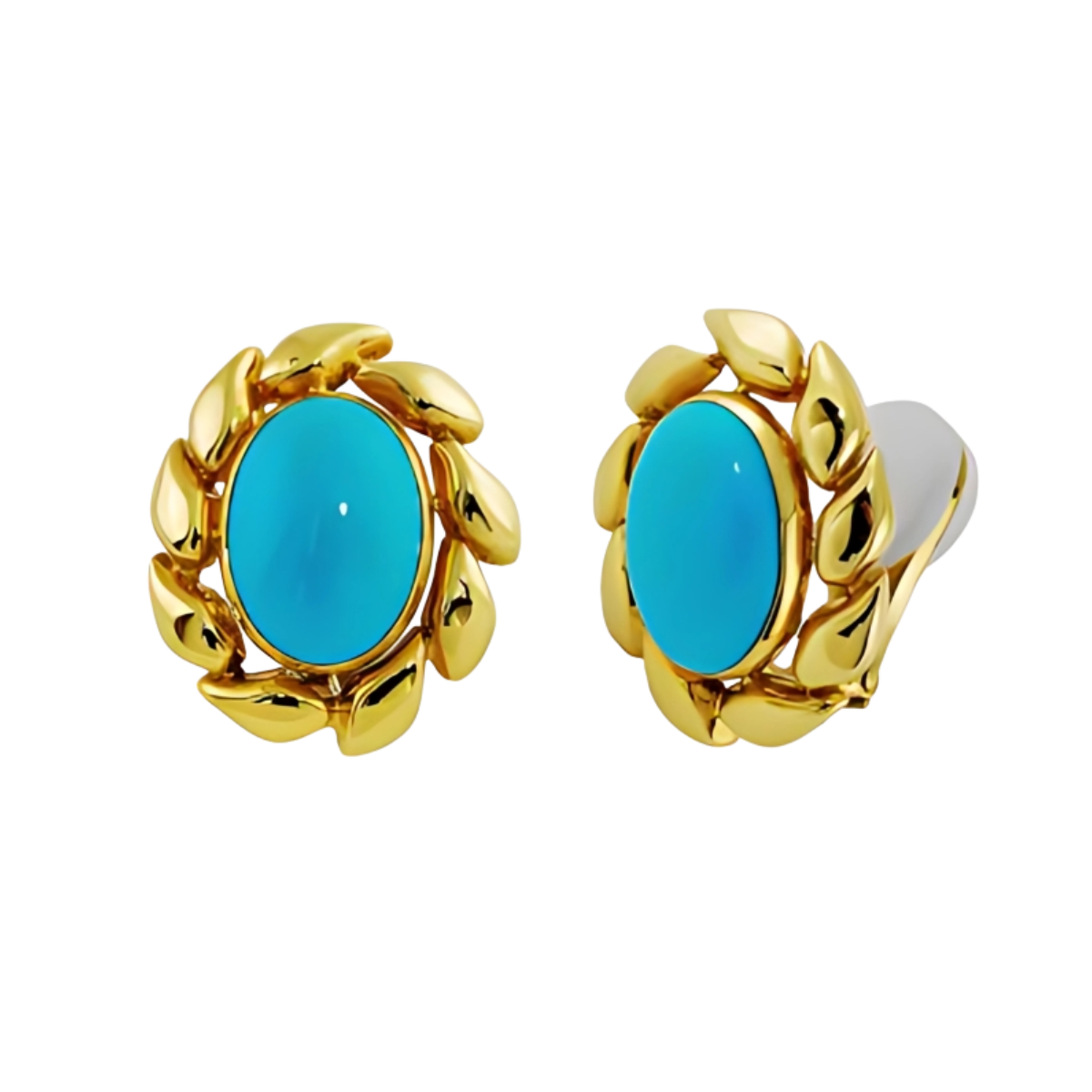 Turquoise and Gold Earrings, Handmade in 18k Yellow Gold with 2 Oval Turquoise Weighing 19.02 Carats Surrounded by a Gold Leaf Design
