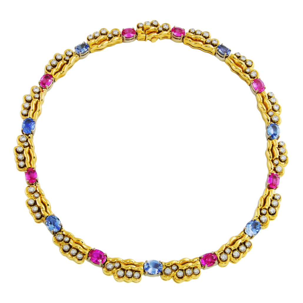Pastel Pink and Blue Double Flowing Lines Sapphire & Diamond Necklace Designed & Handmade by Kaufmann de Suisse in 18kt White and Yellow Gold featuring 8 Oval Pink Sapphires weighing a total of 12.88cts, 7 Oval Blue Sapphires weighing a total of 12.16cts and 75 Round Brilliant cut F/VVS Quality Diamonds weighing a total of 3.84cts