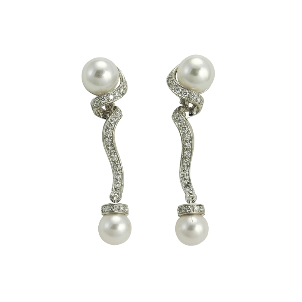 Pearl & Diamond Swirl Drop Earrings Designed and Handmade by Kaufmann de Suisse in 18kt White Gold featuring 4 Cultured Pearls measuring 7.5 – 8.5mm and 60 Round Brilliant cut F/VVS Quality Diamonds weighing a total of 0.62cts