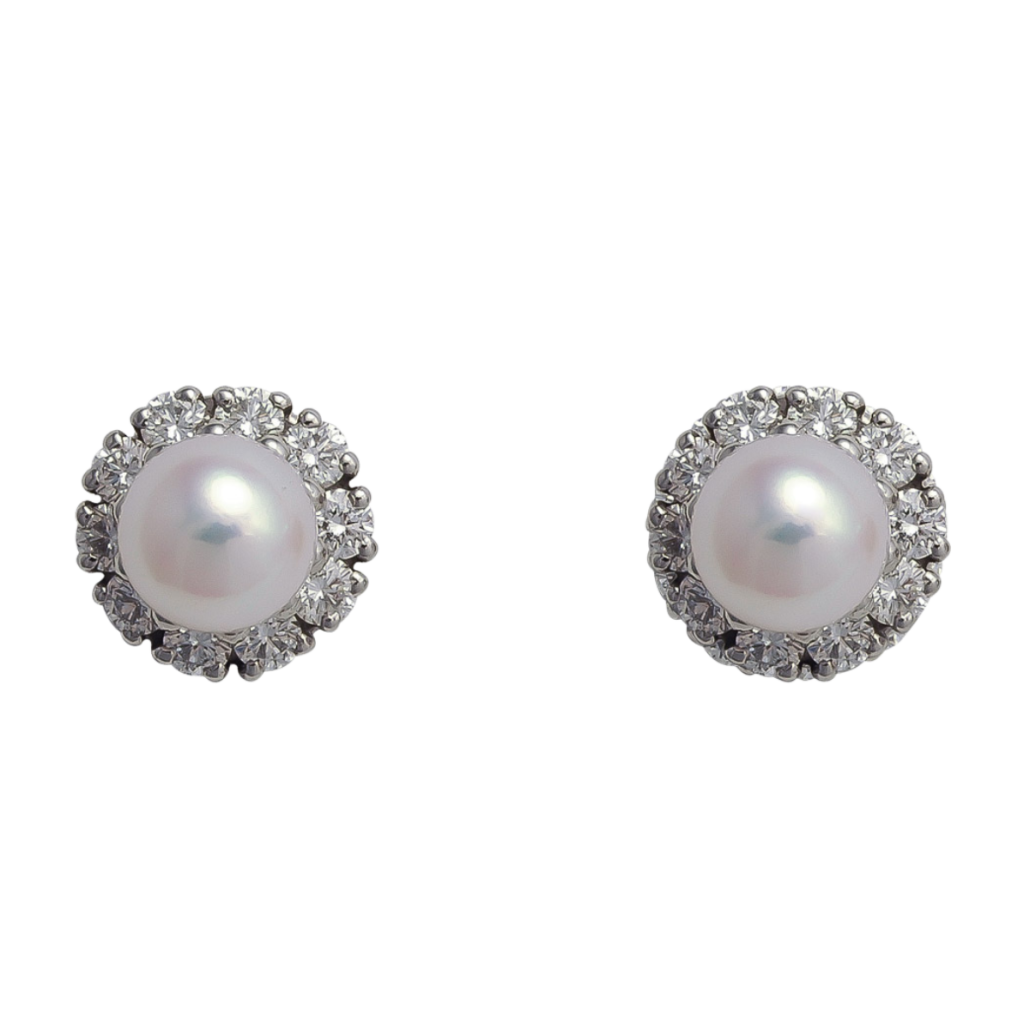 Classic Pearl & Diamond Studs Designed & Handmade by Kaufmann de Suisse in Platinum featuring 2 Akoya Pearls measuring 7.4mm and 20 round Brililant cut F/VVS Quality Diamonds weighing a total of 1.27cts