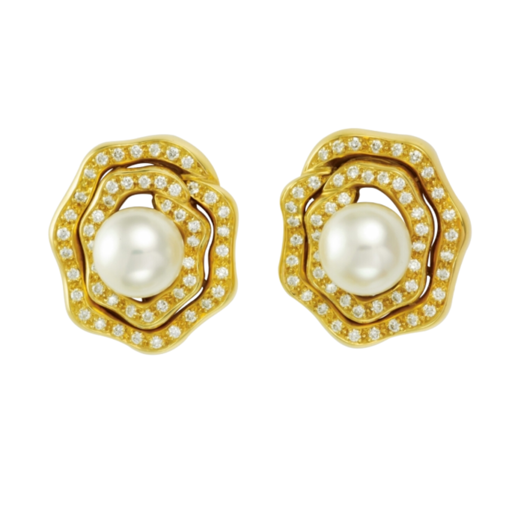 Pearl and Diamond Clip on Earrings Designed & Handmade by Kaufmann de Suisse in 18kt Yellow Gold featuring 2 Akoya 10.30mm Pearls with Rose Overtone surrounded by 100 Round Brilliant Cut F/VVS Quality Diamonds weighing a total of 1.26cts