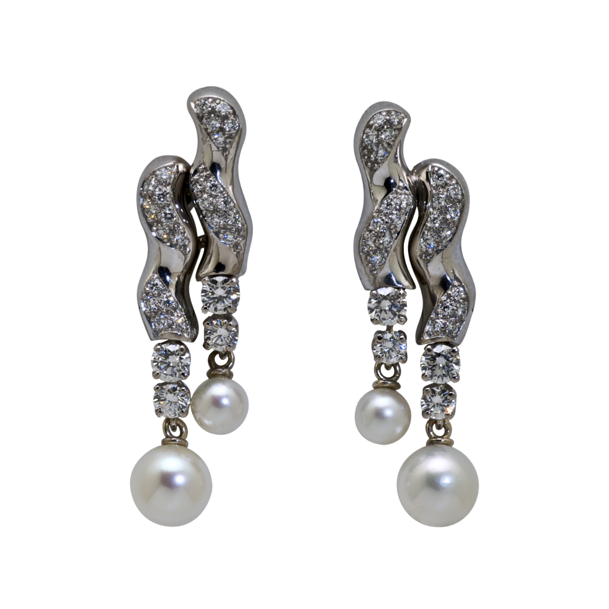 Flowing Lines Pearl & Diamond Dangle Drop Earrings Designed & Handmade by Kaufmann de Suisse in 18kt White Gold featuring 4 Akoya Pearls measuring 5-8mm and 56 Round Brilliant cut F/VVS Quality Diamonds weighing a total of 1.60cts