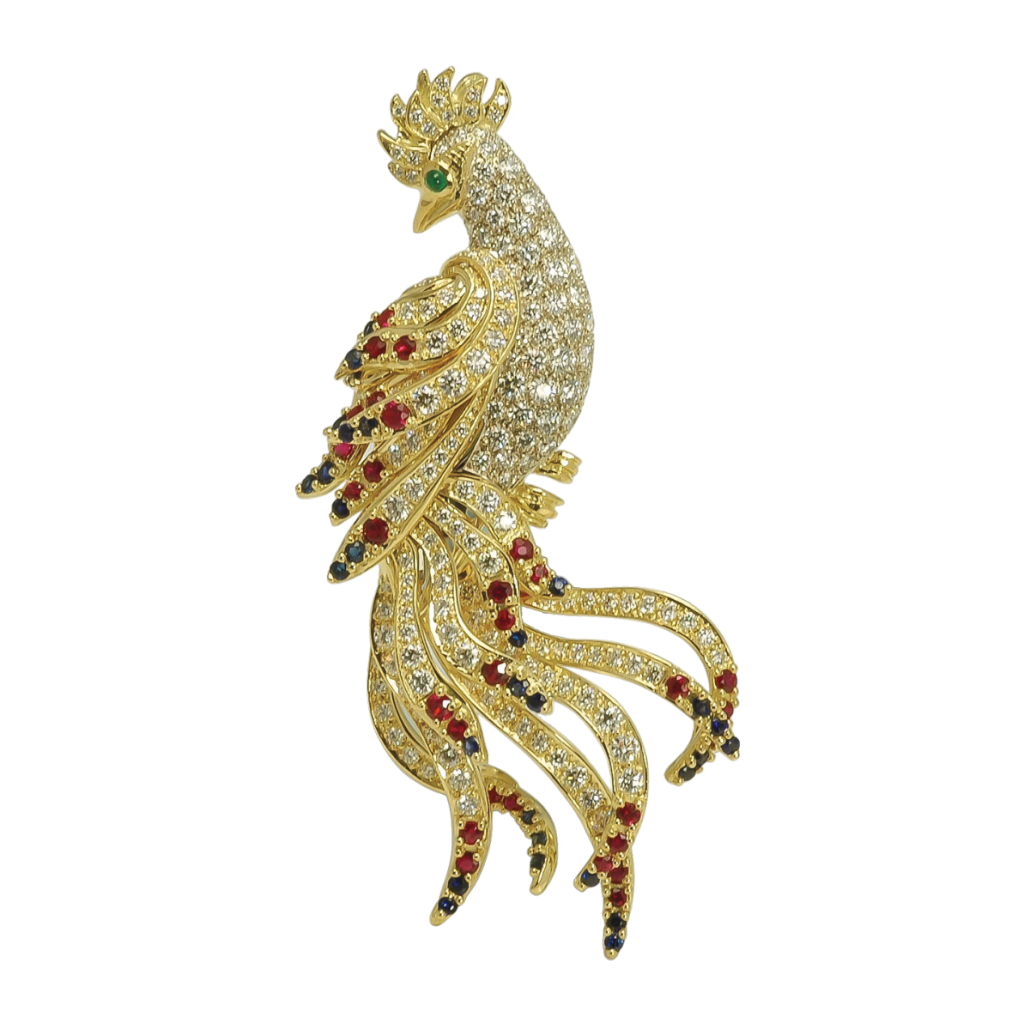 Phoenix Pin Designed & Handmade by Kaufmann de Suisse in 18kt White Gold featuring 182 Round Brilliant Cut F/VVS Quality Diamonds weighing a total of 5.63cts, 53 Round Brilliant cut Rubies weighing a total of 3.20cts, 28 Round Brilliant Cut Emeralds weighing a total of 0.79cts, and 1 Cabochon Cut Emerald weighing 0.06cts