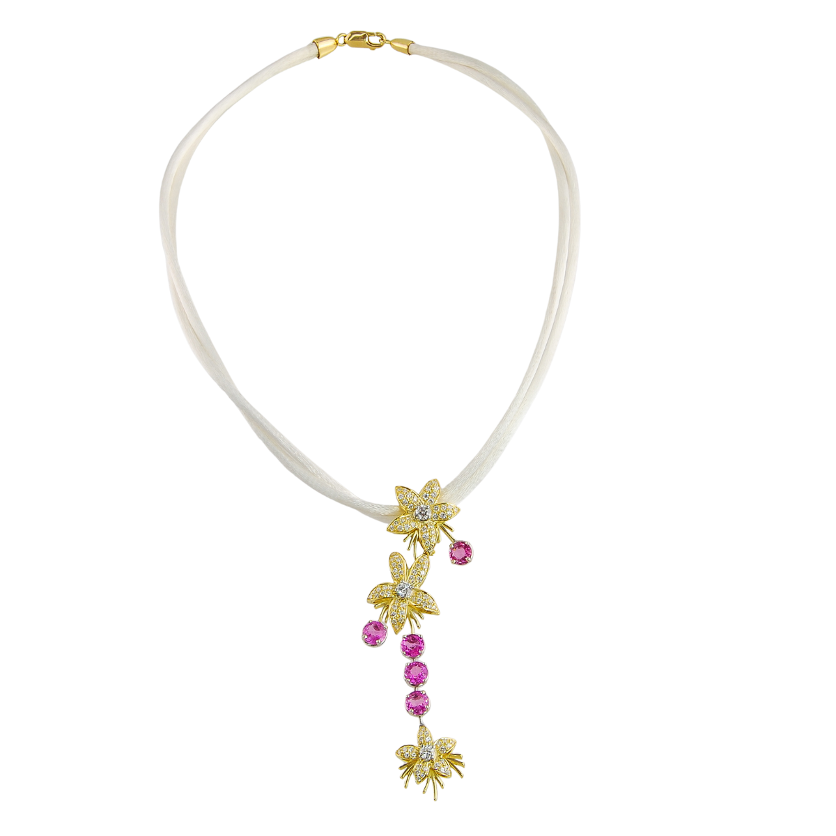 Jasmin de Nuit Pendant Designed & Handmade by Kaufmann de Suisse in 18kt Yellow Gold featuring 102 Round Brilliant Cut G/VS Quality Diamonds weighing a total of 1.23cts and 5 Round Brilliant cut Pink Sapphires weighing a total of 4.00cts, hung on a Cream Colored Silk Cord with Gold Clasp