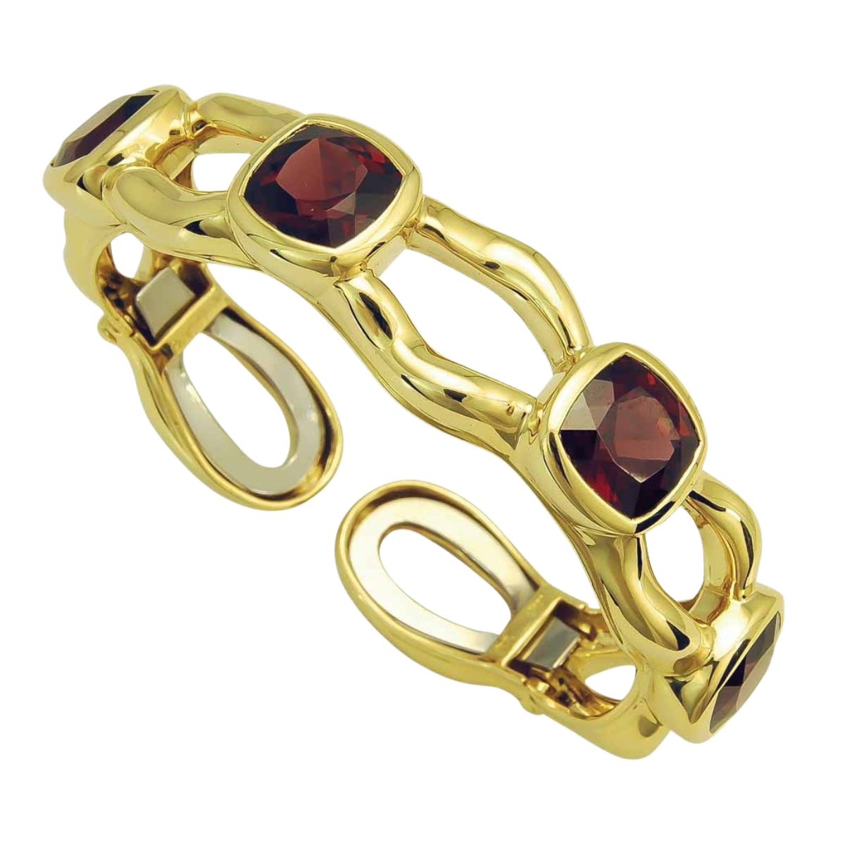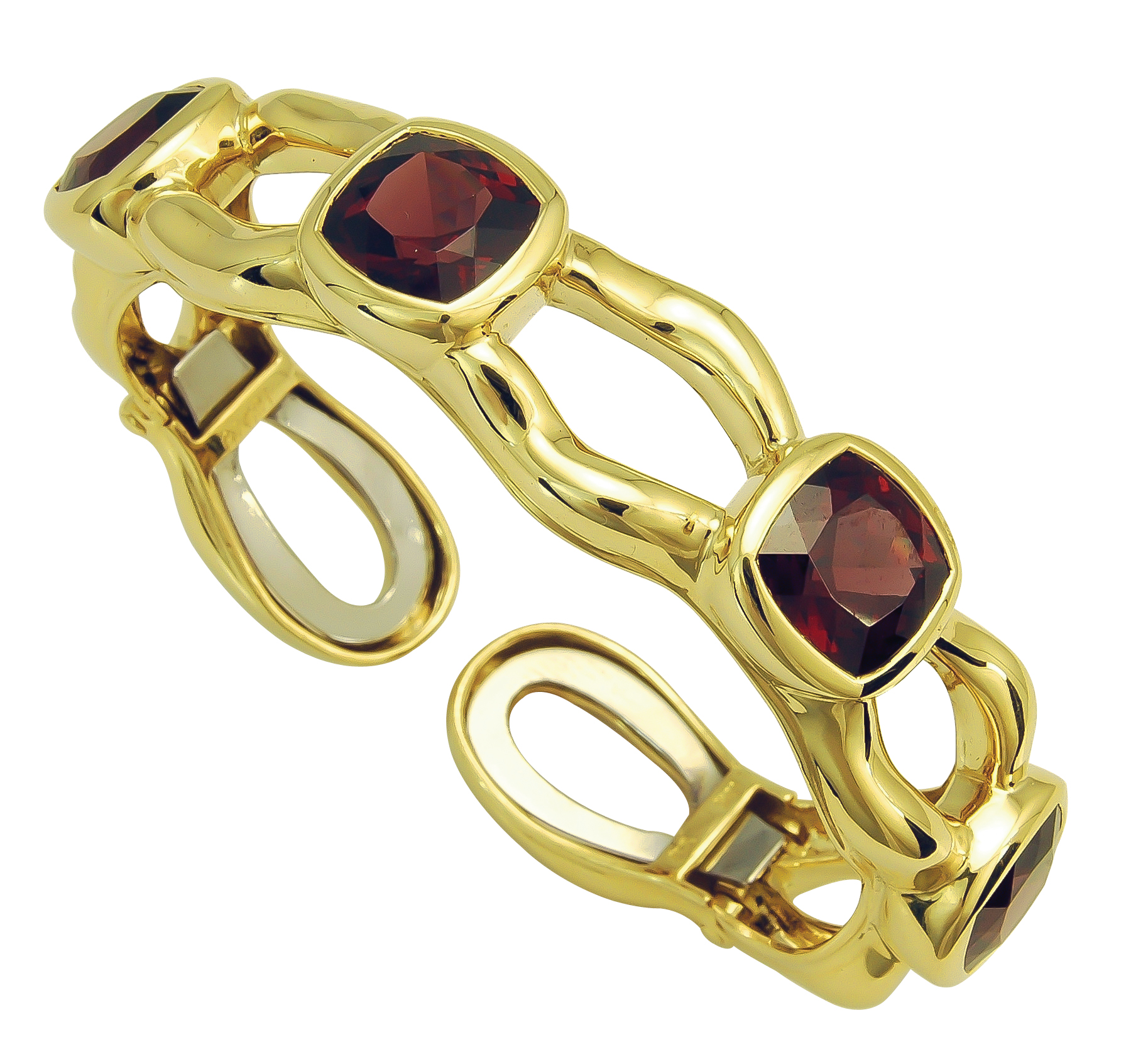 Tsarina Rhodolite Clip Bangle Designed & Handmade by Kaufmann de Suisse in 18kt Yellow Gold featuring 4 Cushion cut Rhodolite Garnets weighing a total of 21.04cts