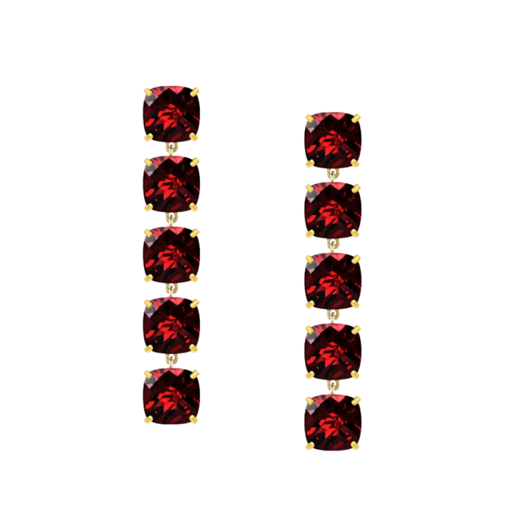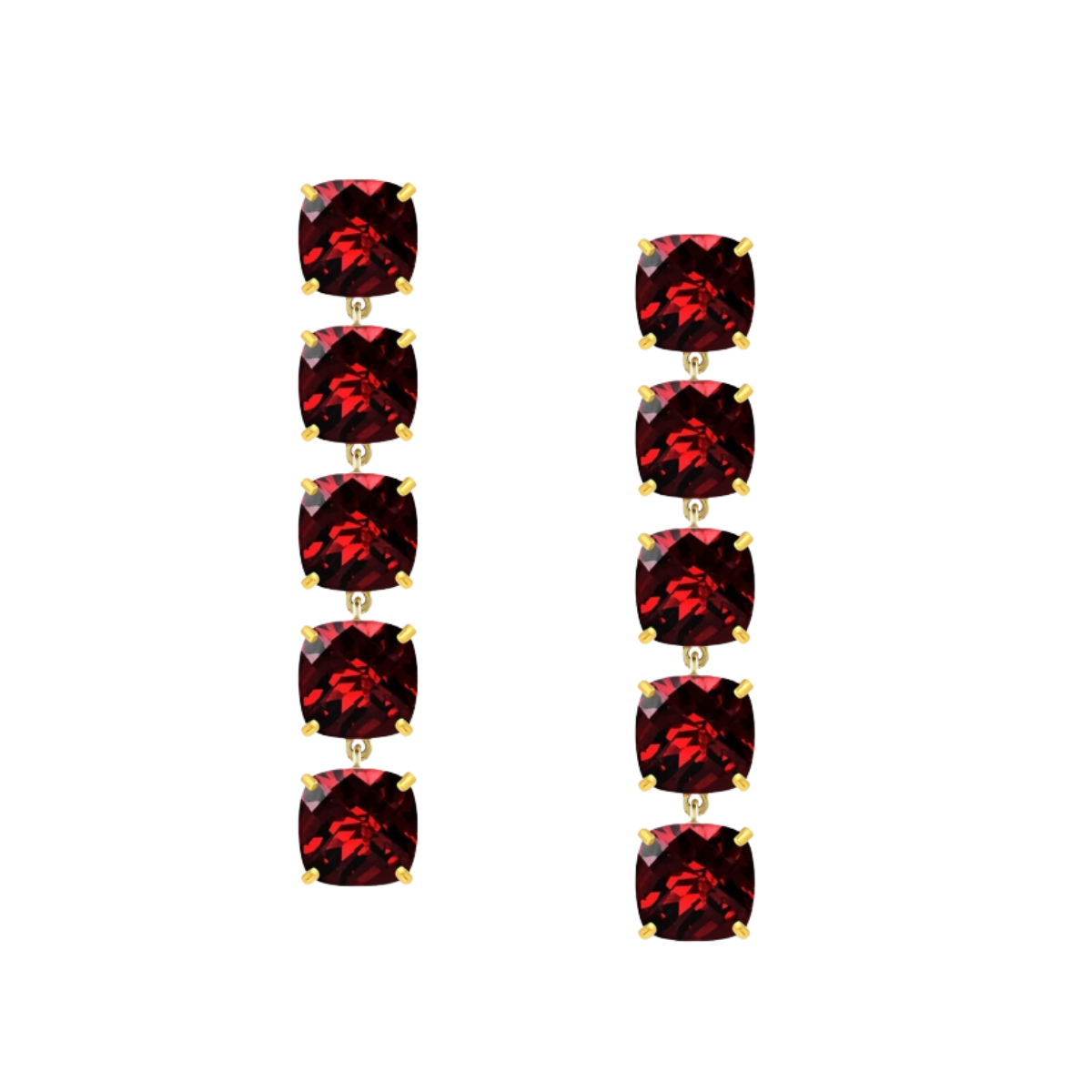 Rhodolite Garnet Dangle Drop Earrings Designed & Handmade by Kaufmann de Suisse in 18kt Yellow Gold featuring 12 Cushion Cut Rhodolite Garnets weighihng a total of 19.44cts