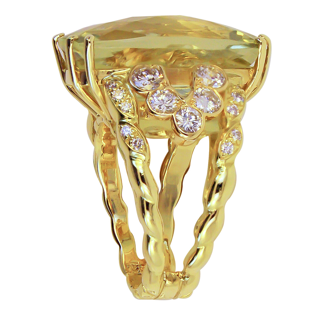 Double Flowing Lines Lemon Quartz and Diamond Ring Designed & Handmade by Kaufmann de Suisse in 18kt Yellow Gold featuring 19.25cts Cushion Lemon Quartz flanked and mounted with 30 Round Brilliant Cut G/VS Quality Diamonds weighing a total of 1.68cts