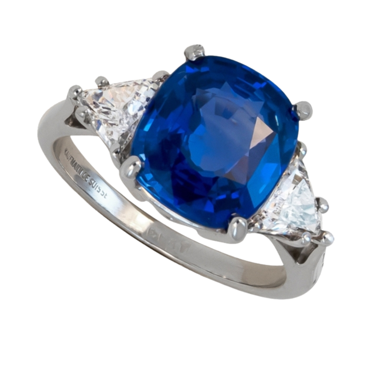 Classic Three Stone Sapphire & Diamond Ring Designed and Handmade by Kaufmann de Suisse in Platinum featuring one Cushion Cut 4.87cts Blue Sapphire flanked by two H/VS Quality Triangle Diamonds weighing a total of 1.00cts