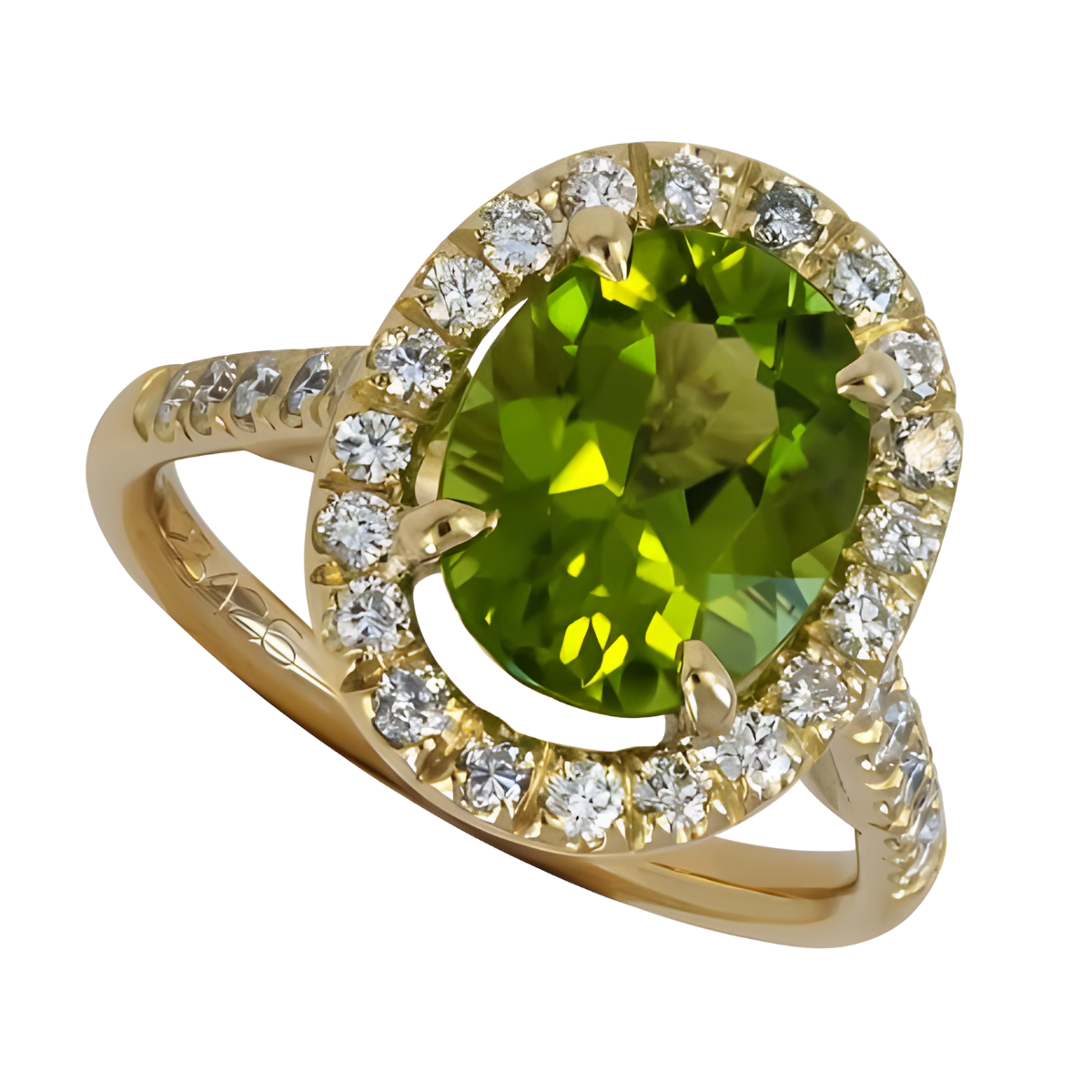 Peridot and Diamond Ring, Handmade in 18k Yellow Gold with an Oval Peridot Weighing 2.77 Carats and 30 Round Diamonds Weighing .60 Carats Total