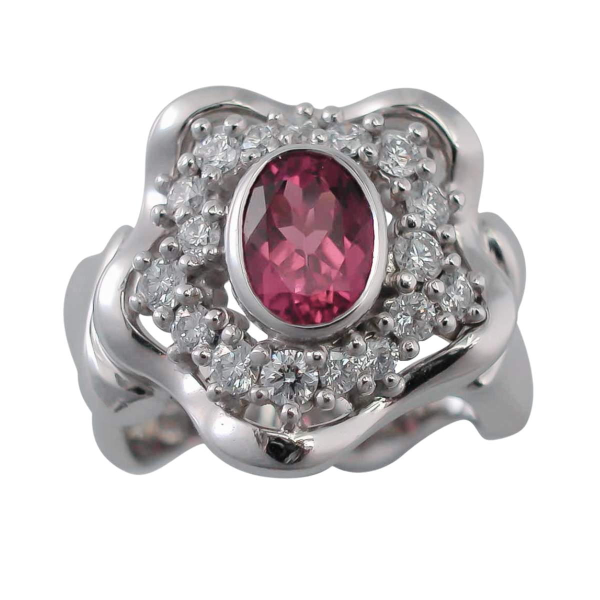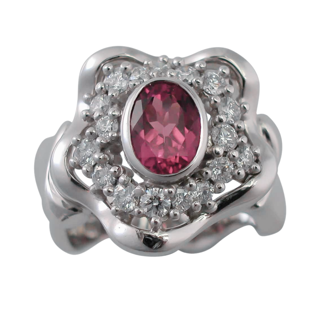 Pink Tourmaline and Diamond Wave Ring Designed & Handmade by Kaufmann de Suisse in 18kt White Gold featuring 1 Pink Tourmaline weighing 1.34cts and 17 Round Brilliant Cut F/VVS Quality Diamonds weighing a total of 0.68cts