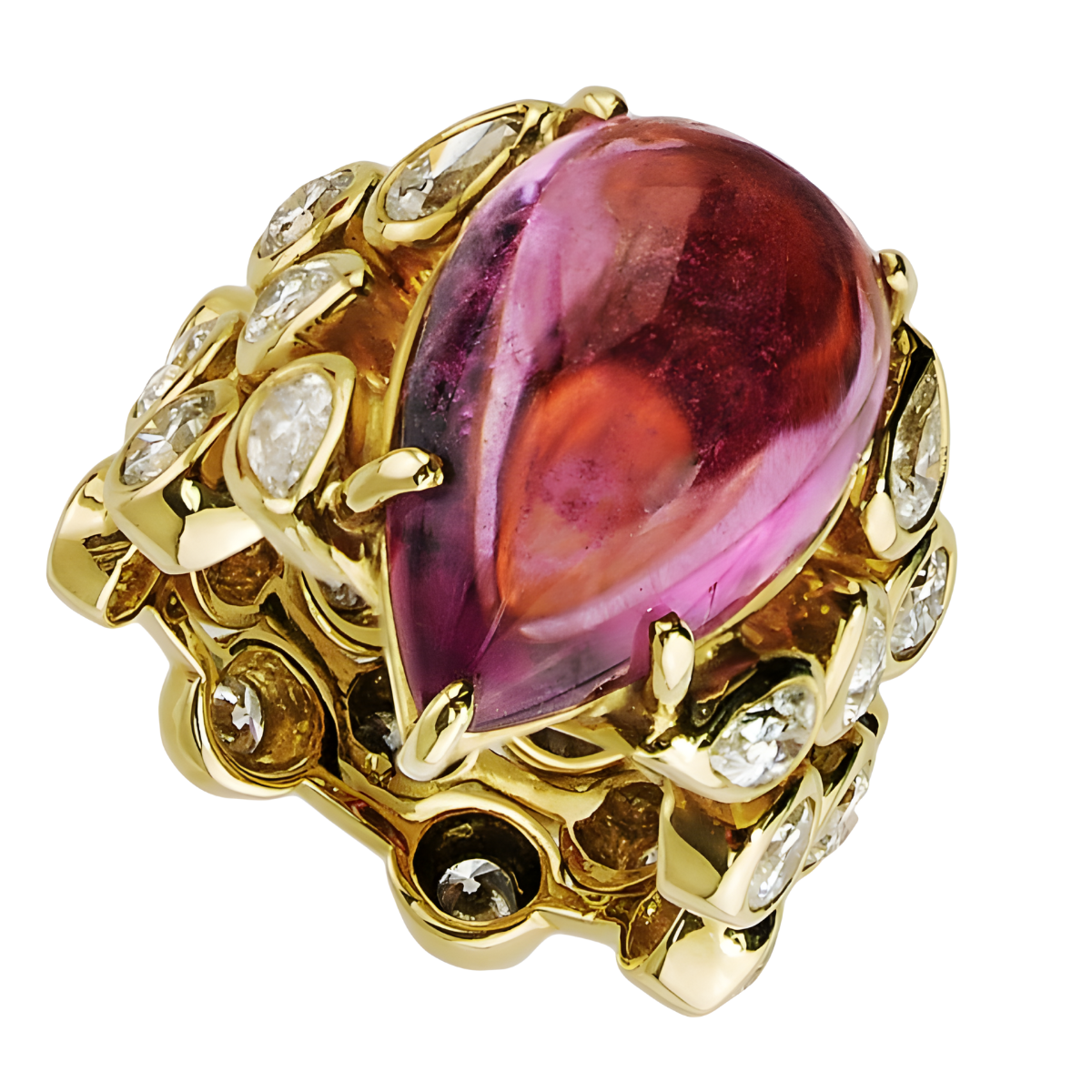 Three Row Cascade Splash Ring Designed & Handmade by Kaufmann de Suisse in 18kt Yellow Gold featuring 1 Cushion Cut Rubellite weighing 32.51cts mounted with 23 Brilliant Cut G/VS Quality Diamonds weighing a total of 3.49cts.