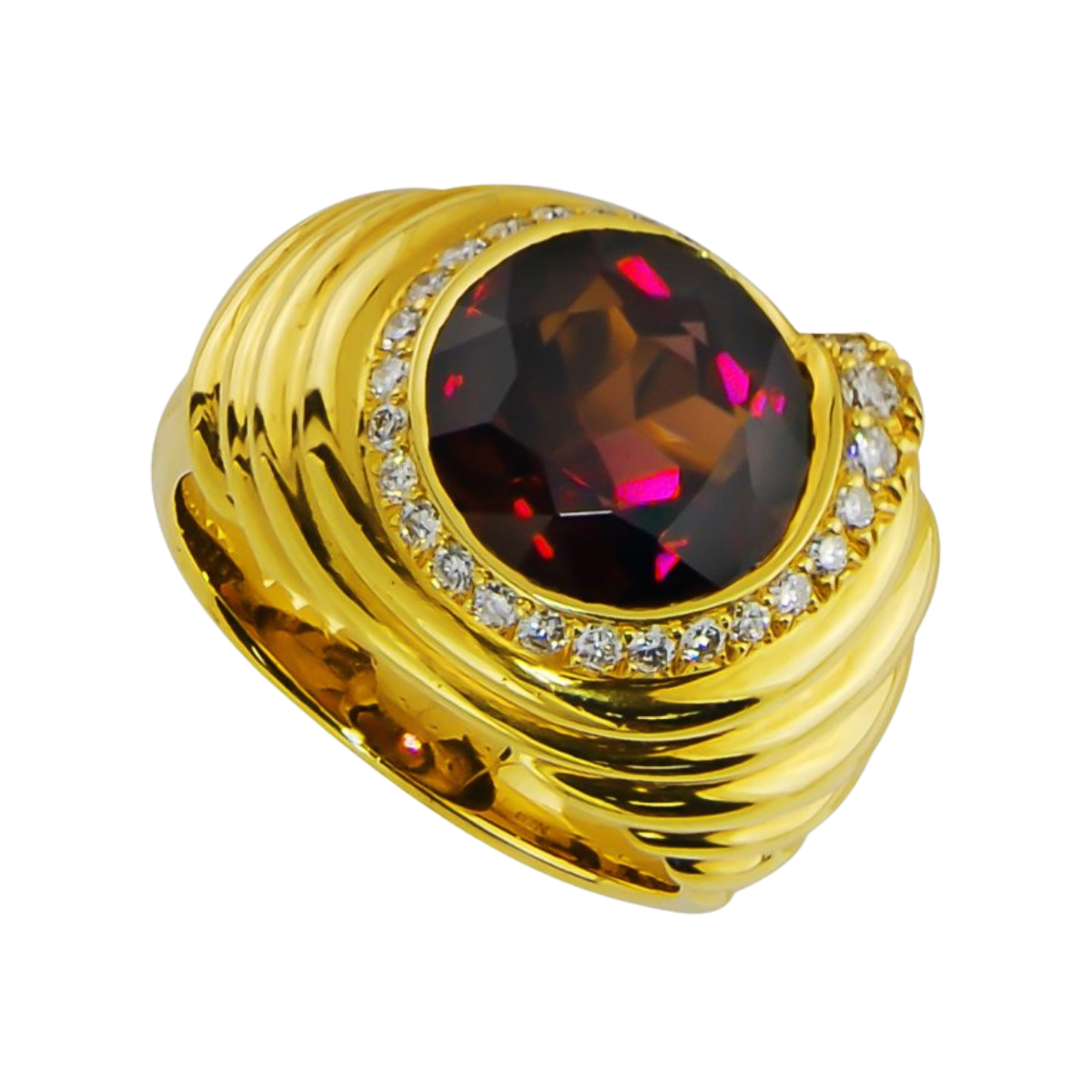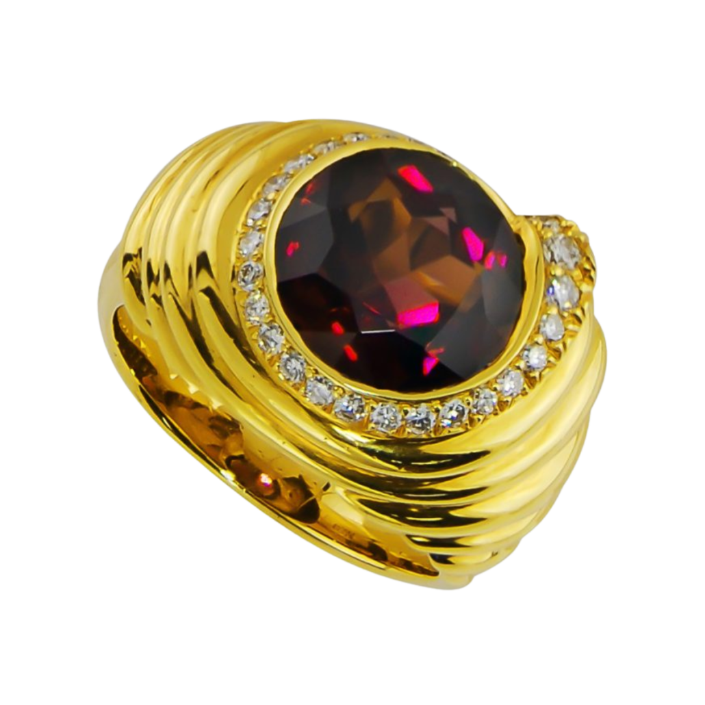 Bezel Set Rhodolite and Diamond Ring, Handmade in 18k Yellow Gold with a Round 5.95 Carat Rhodolite and 27 Round Diamonds Weighing .20 Carats Total