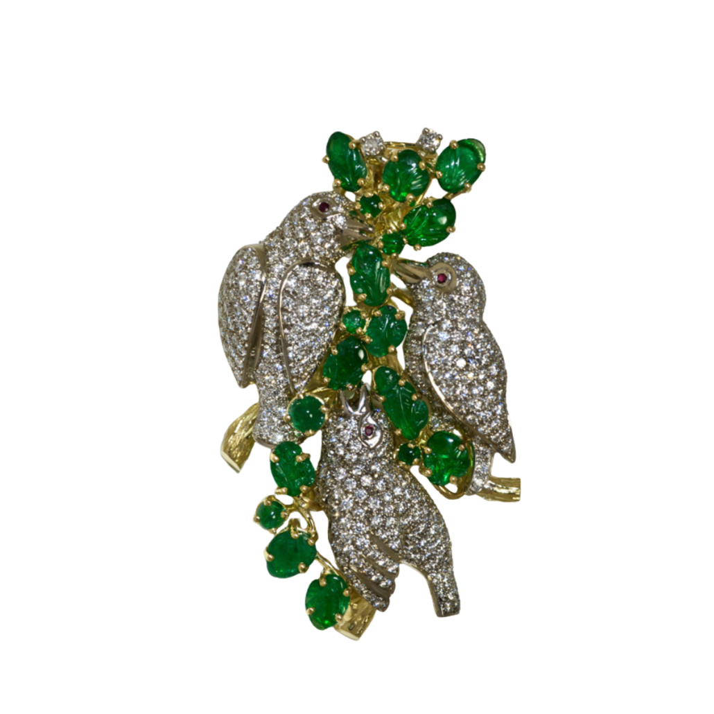 Robin’s Nest Pendant Necklace Designed & Handmade by Kaufmann de Suisse in 18kt White and Yellow Gold featuring 402 Round Brilliant Cut F/VVS Quality Diamonds weighing a total of 3.00cts, 19 Carved Emeralds weighing a total of 3.33cts and 3 Round Rubies weighing a total of 0.03cts