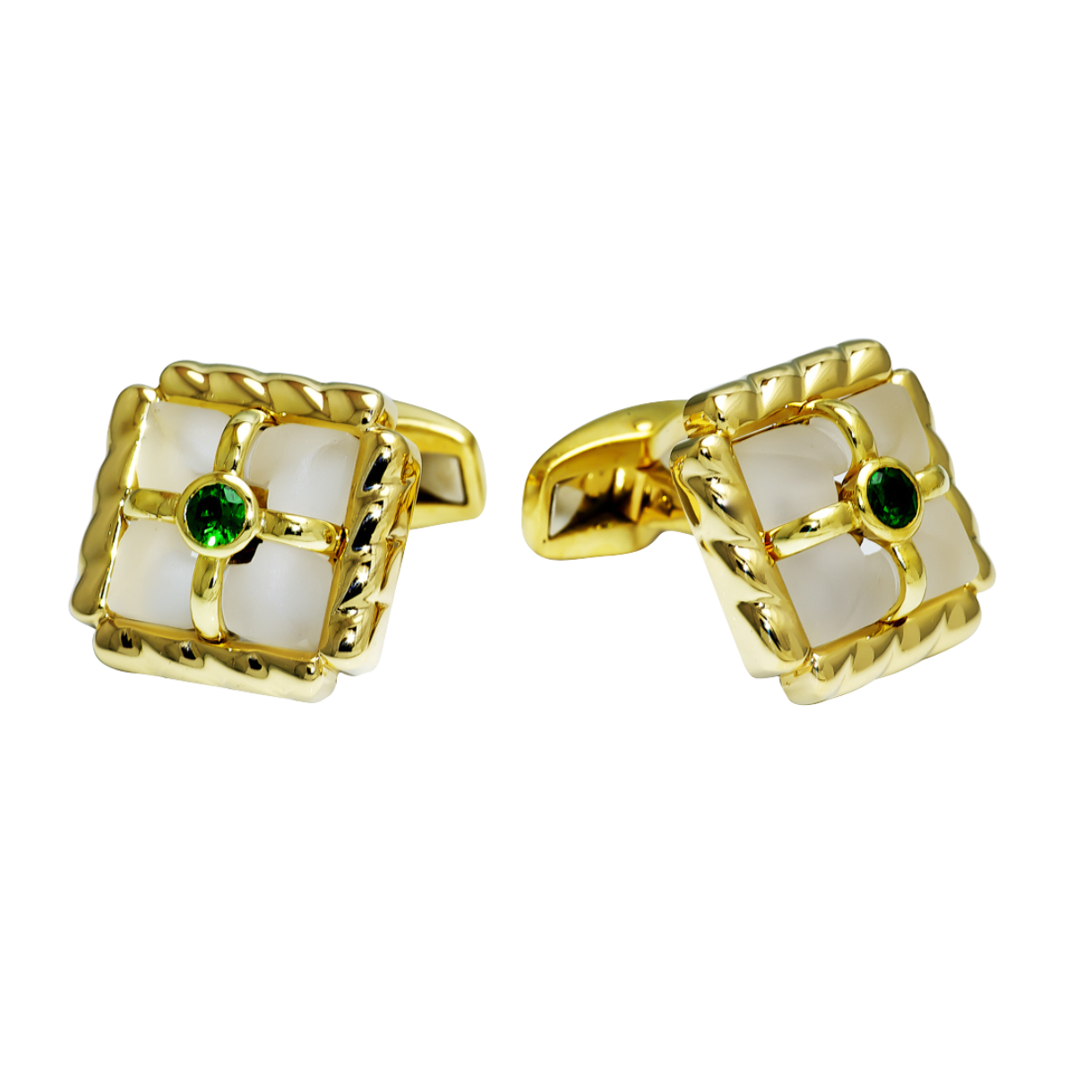 Rock Crystal & Tsavorite Flowing Lines Cufflinks Designed & Handmade by Kaufmann de Suisse in 18kt Yellow Gold featuring 2 Carved Rock Crystals measuring 12 x 12 and 2 Round Bezel Set Tsavorites weighing a total of 0.61cts