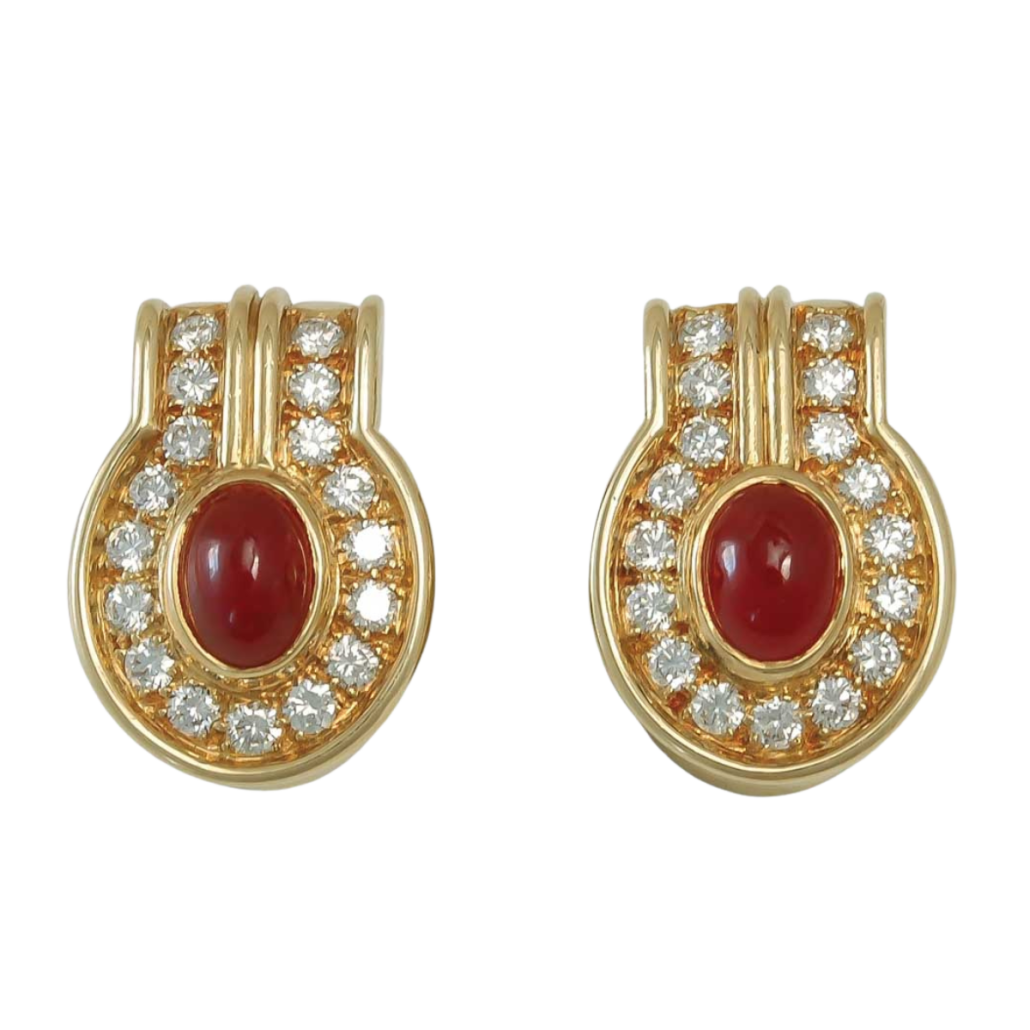 Classic Ruby & Diamond Earrings Designed & Handmade by Kaufmann de Suisse in 18kt Yellow Gold featuring 2 Cabochon Cut Oval Rubies weighing a total of 3.20cts and 34 Round Brilliant Cut F/VVS Quality Diamonds weighing a total of 1.40cts