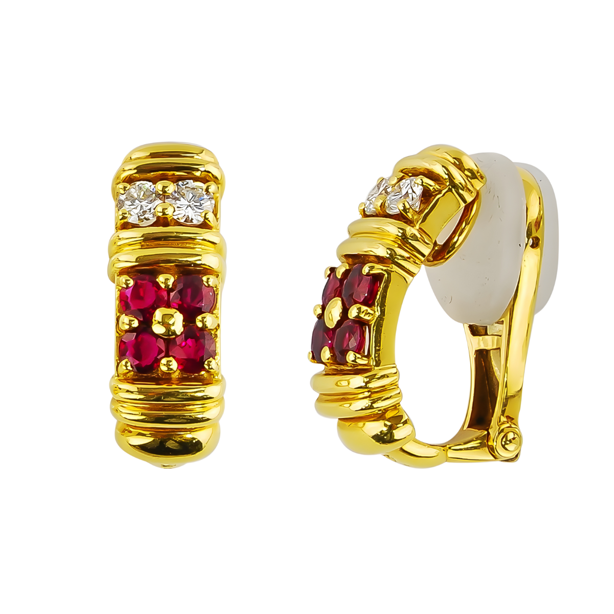 Classic Ruby & Diamond Rectangular Clip On Huggies Designed & Handmade by Kaufmann de Suisse in 18kt Yellow Gold featuring 8 Round No Heat Rubies weighing a total of 1.59cts and 4 Round Brilliant Cut F/VVS Quality Diamonds weighing a total of 0.61cts