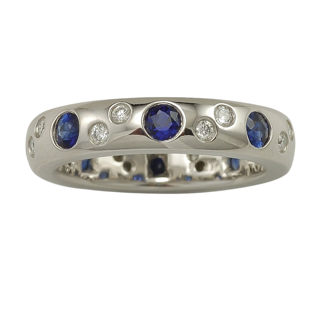 Sapphire & Diamond Full Eternity Band Designed and Handmade by Kaufmann de Suisse in Platinum featuring 8 Bezel Set Blue Sapphires weighing a total of 1.03cts and 16 Round Brilliant Cut F/VVS Quality Diamonds weighing a total of 0.27cts.