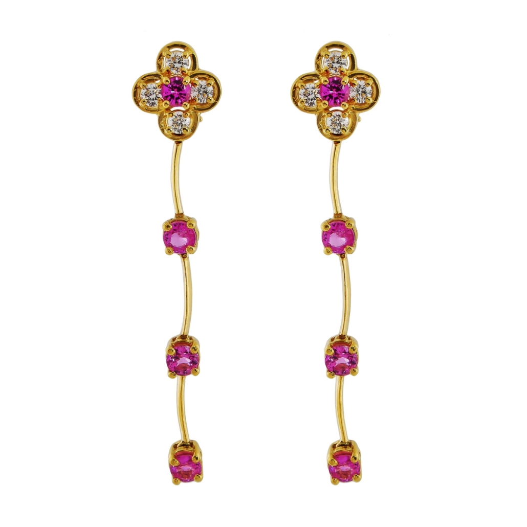 Single Cascade Dangle Drop Earrings Designed & Handmade by Kaufmann de Suisse in 18kt Yellow Gold featuring 8 Round Brilliant Cut Pink Sapphires weighing a total of 4.92cts and 8 Round Brilliant Cut H/SI Quality Diamonds weighing a total of 1.20cts