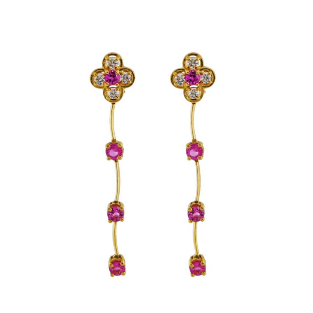 Single Cascade Dangle Drop Earrings with Pink Sapphire and Diamonds in Yellow Gold