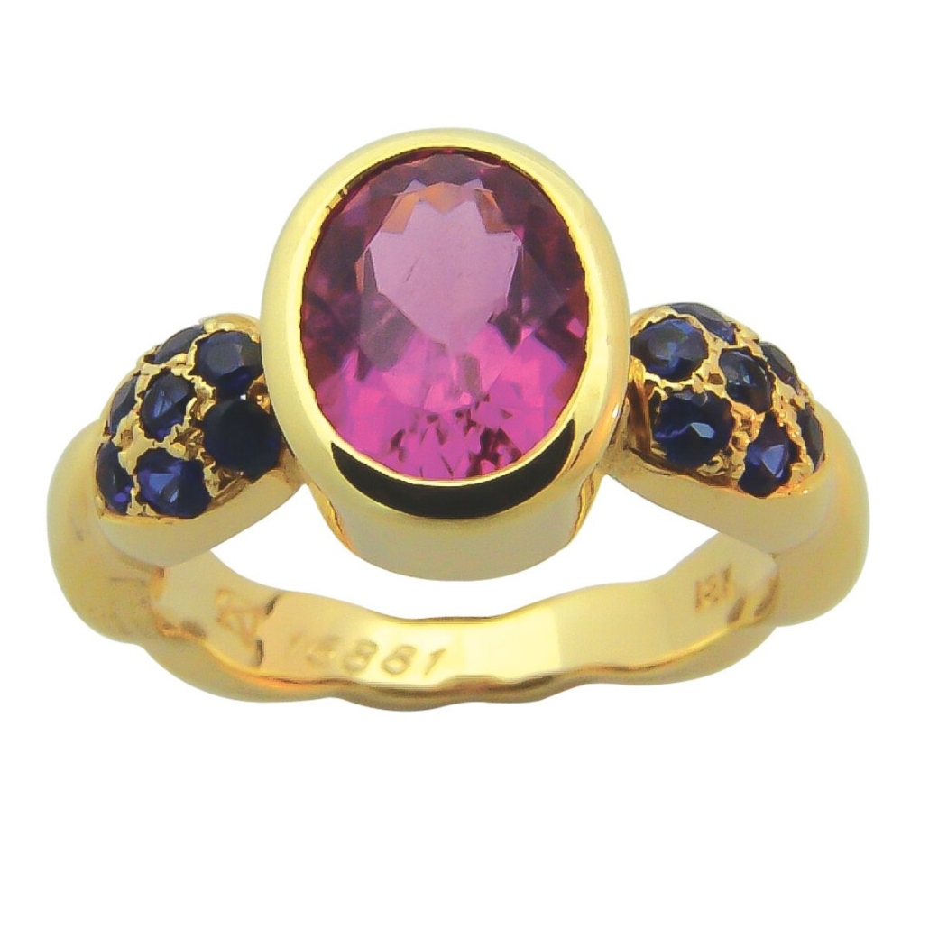 Single Flowing Lines Pink Tourmaline & Blue Sapphire Ring featuring 1 Oval Pink Tourmaline weighing 1.88cts mounted with 14 Round Blue Sapphires weighing 0.53cts.