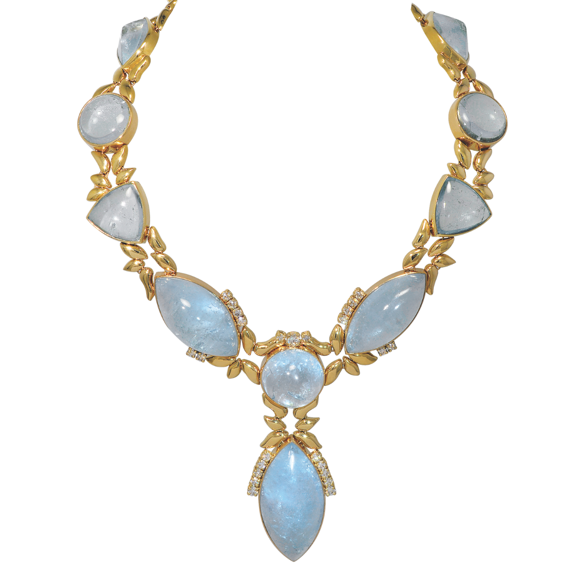 Siren of the Sea Aquamarine Necklace Designed & Handmade by Kaufmann de Suisse in 18kt Yellow Gold featuring 13 Cabochon Cut Aquamarines weighing a total of 628.85cts and 25 Round Brilliant cut G/VS Quality Diamonds weighing a total of 3.68cts