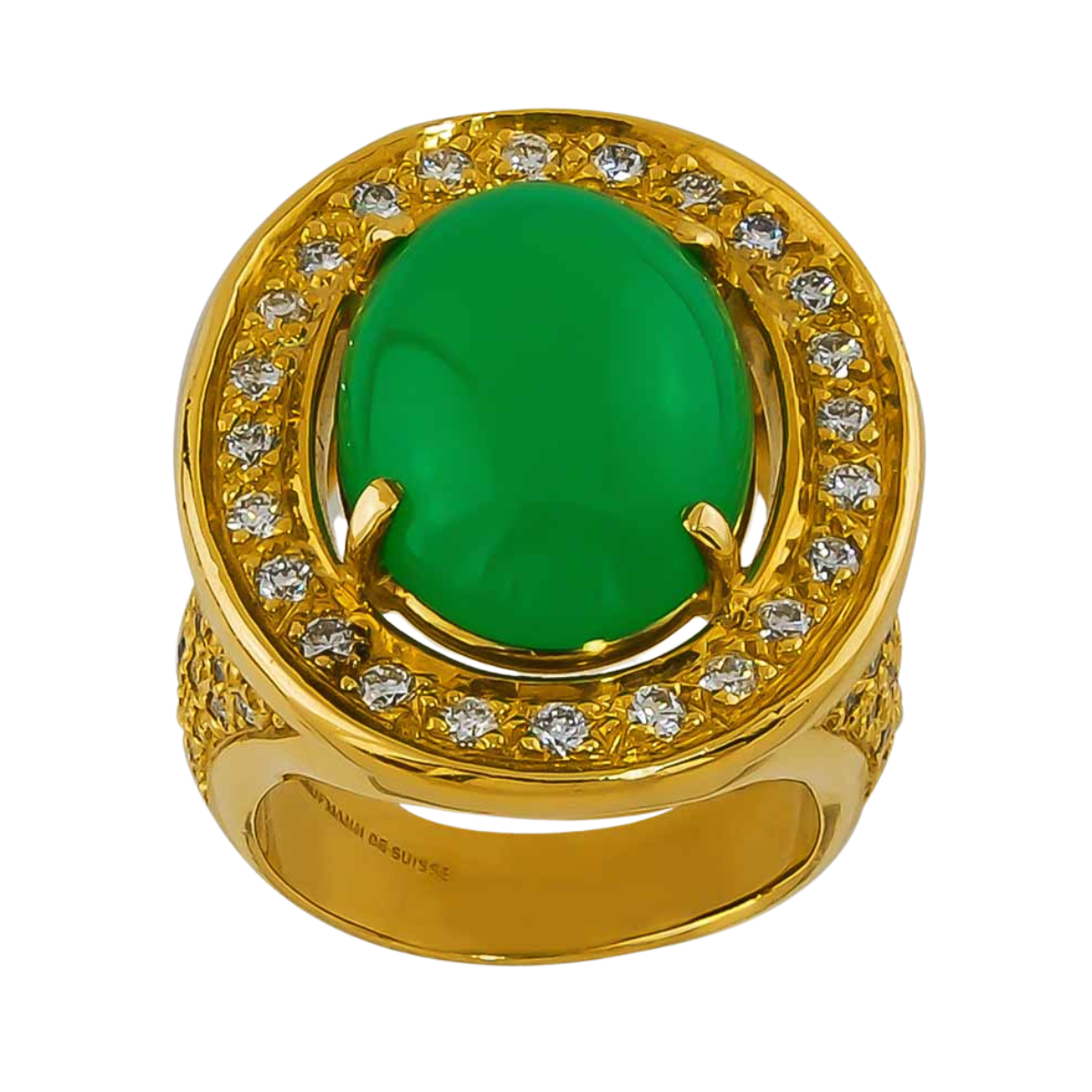 Soleil Chrysoprase and Diamond Ring Designed & Handmade by Kaufmann de Suisse in 18kt Yellow Gold featuring 1 Oval Chrysoprase weighing 7.50cts mounted with 98 Round Brilliant Cut G/VS Quality Diamonds weighing a total of 1.25cts