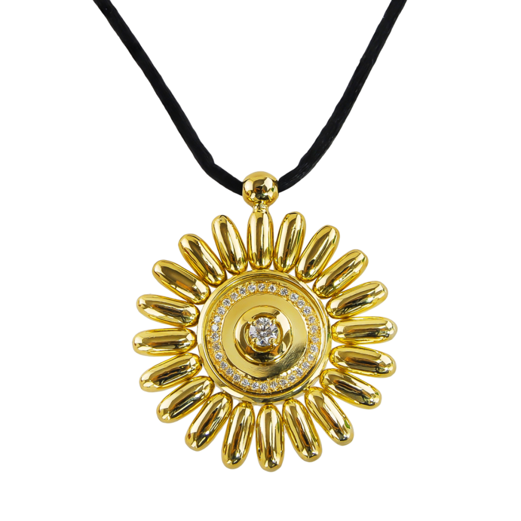 Soleil Diamond Necklace Designed & Handmade by Kaufmann de Suisse in 18kt Yellow Gold featuring one 0.41cts G/SI Quality Round Brilliant Cut Diamond mounted with 32 Round Brilliant Cut G/SI Quality Diamonds weighing a total of 0.73cts