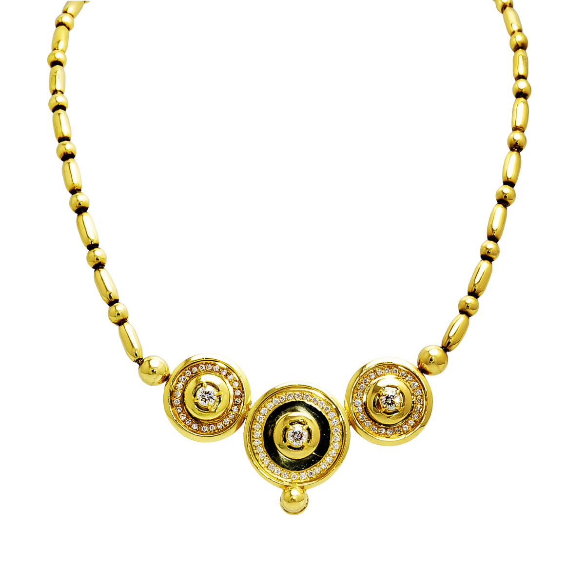 Soleil Diamond Necklace Designed & Handmade by Kaufmann de Suisse in 18kt Yellow Gold featuring 3 Round Brilliant Cut H/SI Quality Diamonds weighing a total of 0.90cts and mounted with 76 Round Brilliant Cut H/SI Quality Diamonds weighing a total of 0.76cts