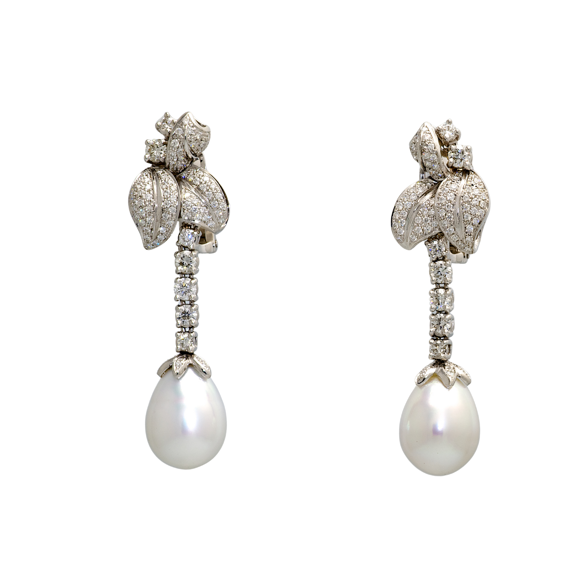 South Sea & Diamond Dangle Drop Earrings Designed & Handmade by Kaufmann de Suisse in 18kt White Gold featuring 2 South Sea 16 by 12mm Teadrop Pearls with Rose Overtone and 178 Round Brilliant Cut F/VVS Quality Diamonds weighing a total of 2.77cts