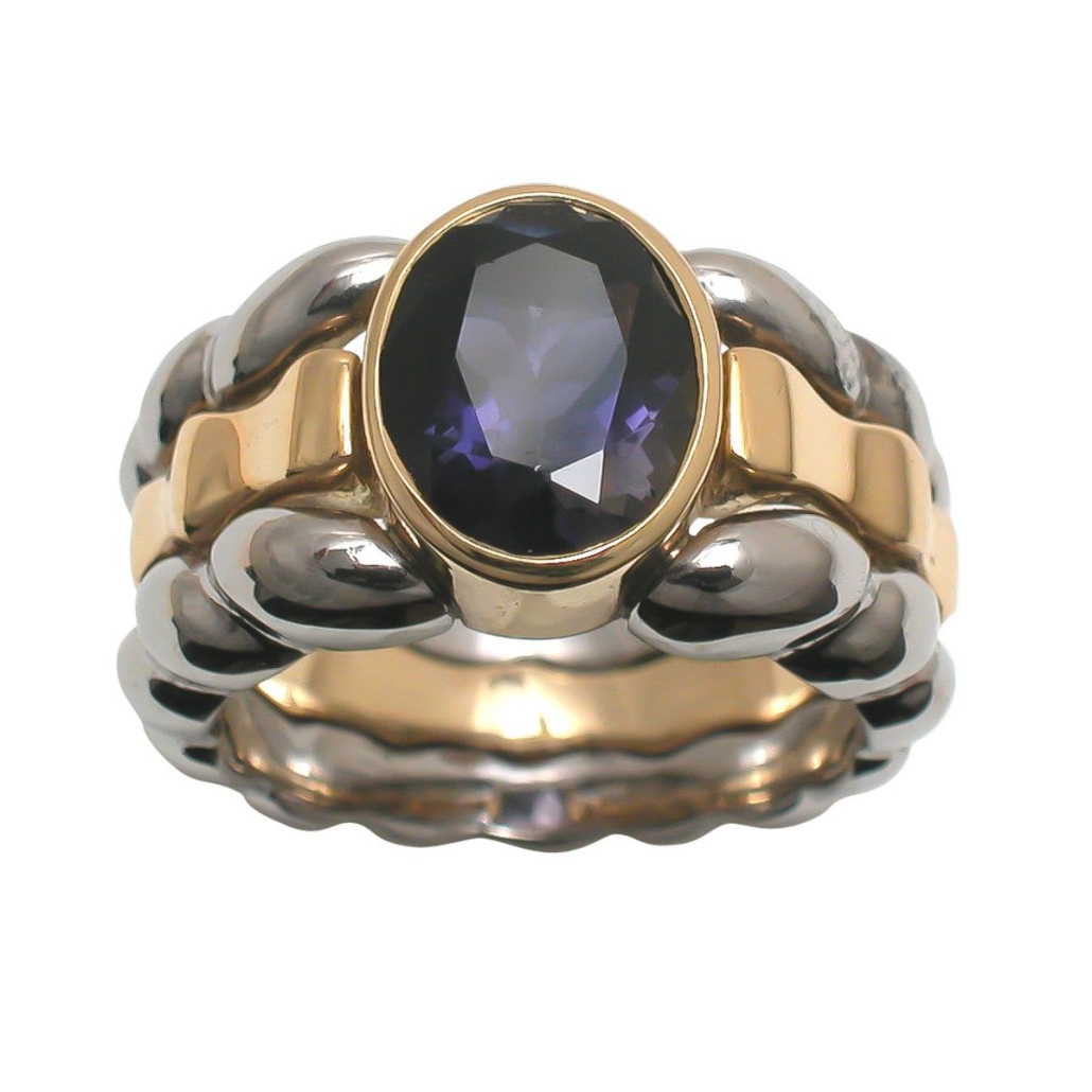 Triple Flowing Lines Ring Designed & Handmade by Kaufmann de Suisse in 18kt Yellow Gold and Stainless Steel featuring 1 Oval Amethyst weighing 6.01cts
