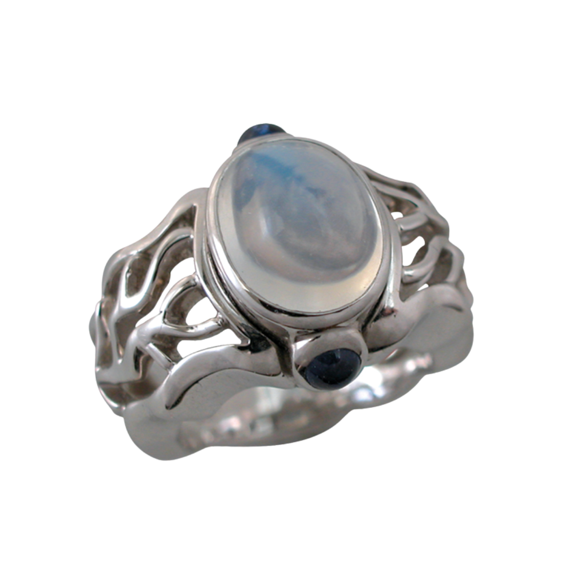 Triple Flowing Lines Moonstone Ring Designed & Handmade by Kaufmann de Suisse in Stainless Steel and 18kt Yellow Gold featuring 1 Oval Cabochon cut Moonstone weighing 4.00cts