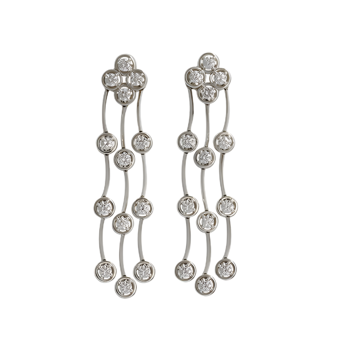 Triple Row “Cascade” Diamond Dangle Earrings, Handmade in 18k White Gold with 26 Round Diamonds (G-VS) Weighing 3.90 Carats Total