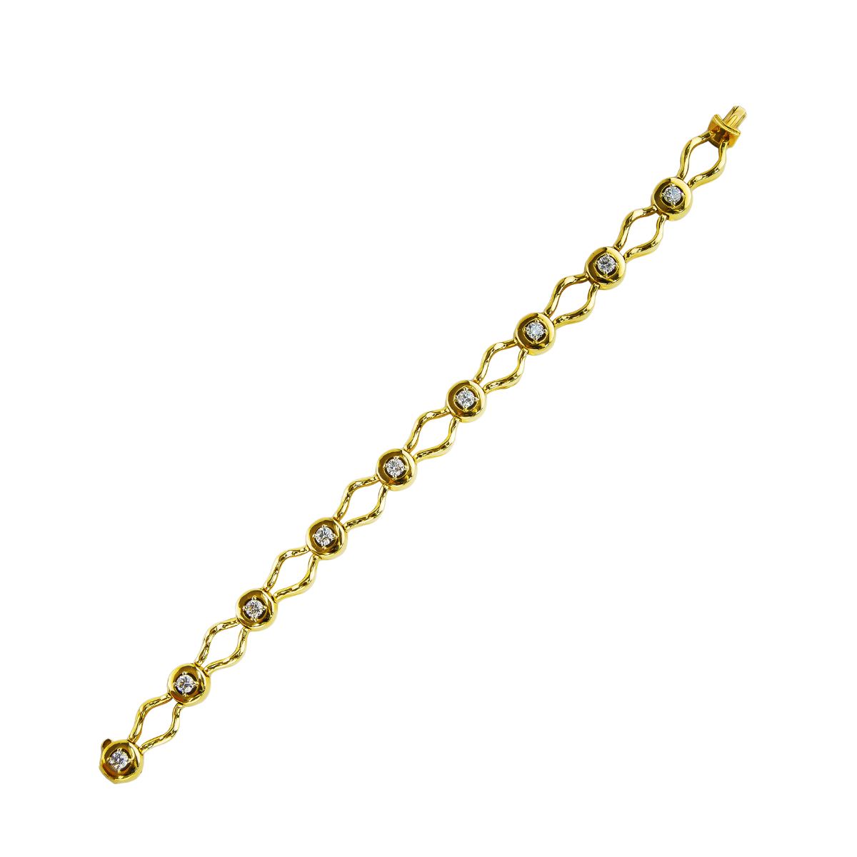 Open Flowing Lines Diamond Bracelet Designed and Handmade by Kaufmann de Suisse in 18kt Yellow Gold featuring 9 Round Brilliant cut G/VS Quality Diamonds weighing a total of 1.61cts.
