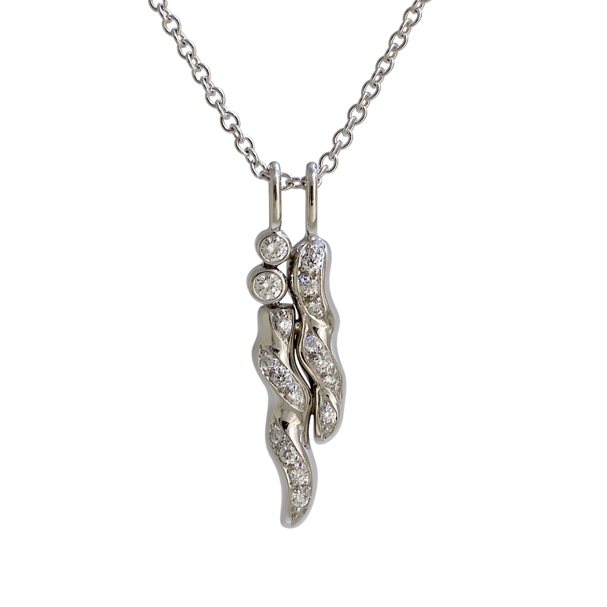 White Gold Flowing Lines Pendant Designed and Handmade by Kaufmann de Suisse in 18kt White Gold featuring 18 Round Brililant cut F/VVS Quality Diamonds weighing a total of 0.19cts hung on a 16 inch White Gold Rolo Chain measuring 0.6mm Wide