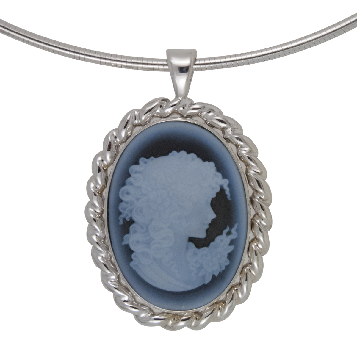 Flowing Lines Pendant Designed & Handmade by Kaufmann de Suisse in 18kt White Gold featuring one Oval Grey Blue Agate Stone with the Cameo of a Lady