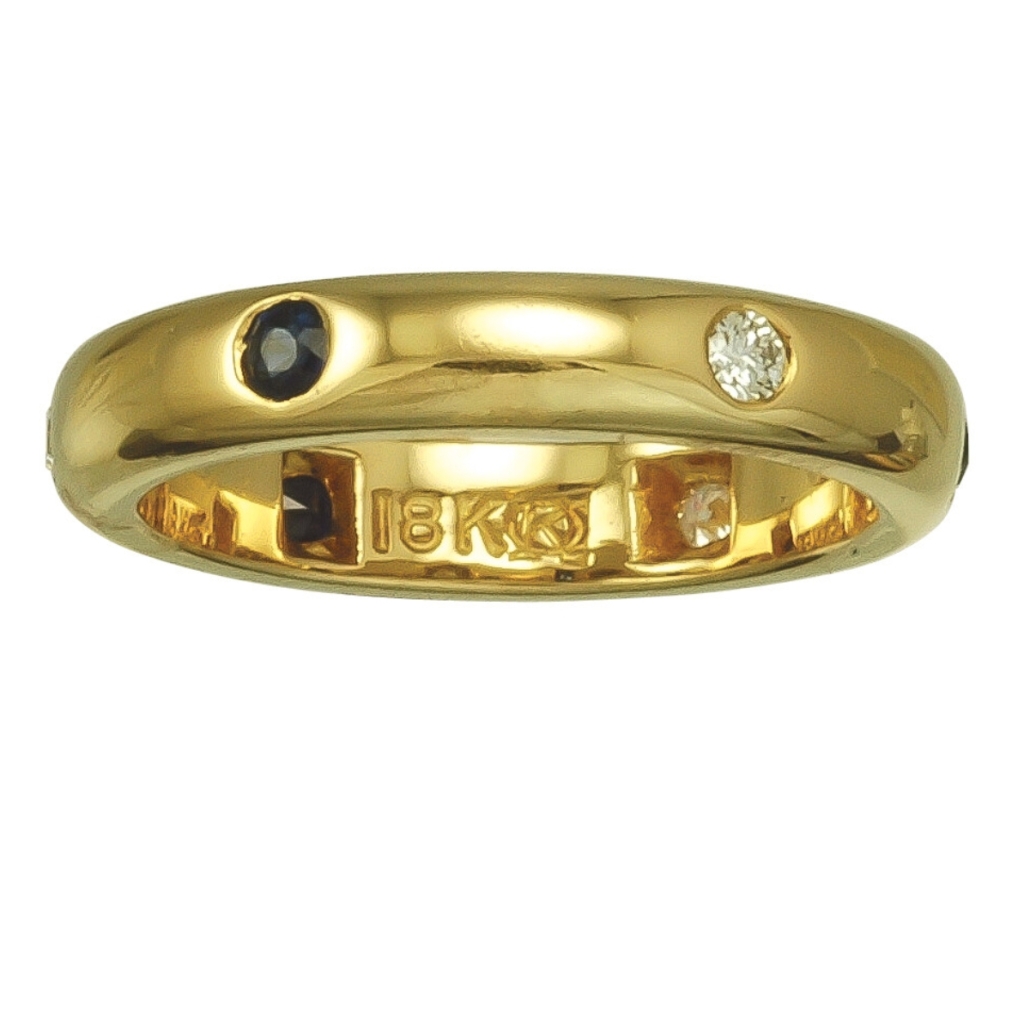 Classic Yellow Gold Eternity Band Designed & Handmade in 18kt Yellow Gold by Kaufmann de Suisse featuring 3 Round Brilliant Cut F/VVS Quality Diamonds weighing a total of 0.15cts and 3 Round Blue Sapphires weighing a total of 0.33cts