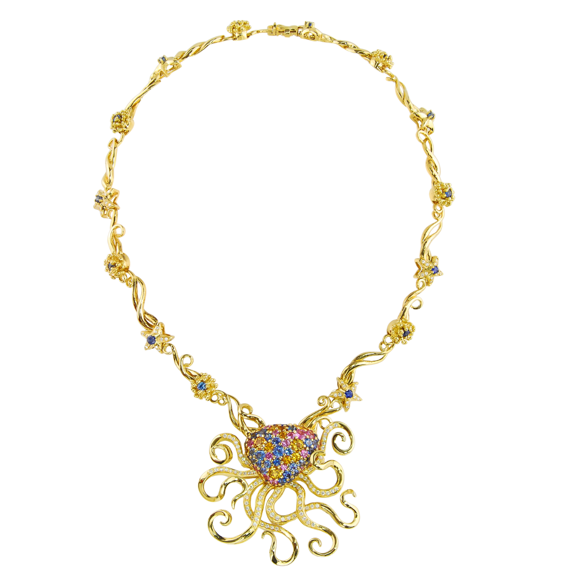Yellow Gold Octopus Necklace with Pink, Blue and Yellow Sapphires and Diamonds