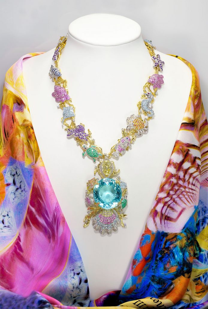 This one-of-a-kind creation designed by Monica Kaufmann of Kaufmann de Suisse Jewelers and named, “The Paraiba Star of the Ocean Jewels” Necklace features The Guiness Book of Records for world’s largest Paraiba Tourmaline – a natural treasure of signifant importance.